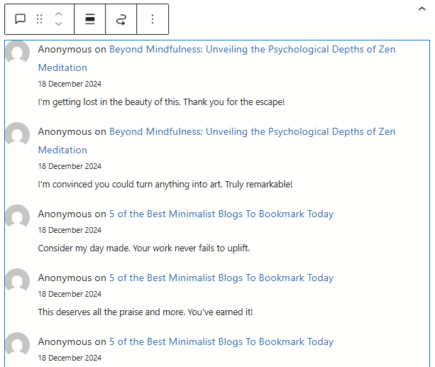 Displays the latest comments left by readers. This is a great way to show site activity and encourage interaction by highlighting real-time engagement.